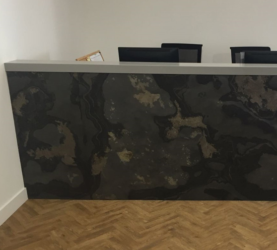 This sheet's stone originates from slatestone, boasting a satin surface with enhanced texture.